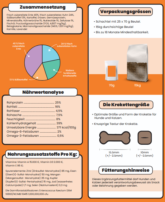 Frisch zubereitete Ente 40%, frisch zubereitetes Huhn 24%,